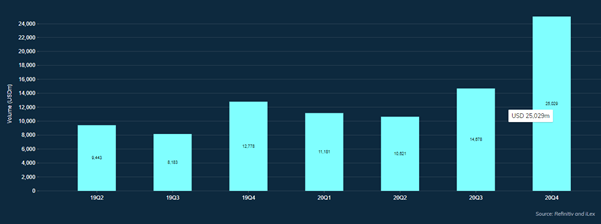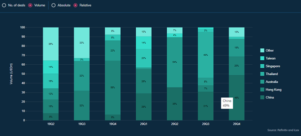 We found that our Acquisition Finance category made up 17% of all APAC ex-Japan volumes in 20Q4 with a total volume of USD25bn closed in that quarter, a marked increase from the previous quarters and the highest proportion in 2 years.
